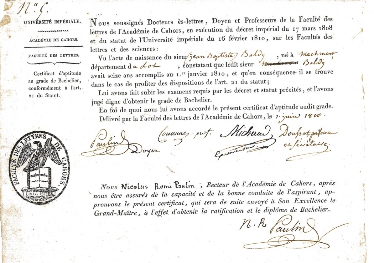 Jusqu’en 1830, l’examen du baccalauréat ès lettres ne comporte que des épreuves orales portant sur des auteurs grecs et latins, sur la rhétorique, l’histoire, la géographie et la philosophie. La première session du baccalauréat a lieu en 1809 : 32 diplômes de bacheliers dont 31 ès lettres et un ès sciences sont délivrés. Puis la barre des 1 000 diplômés est franchie en 1811, avec 983 bacheliers ès lettres et 43 bacheliers ès sciences.