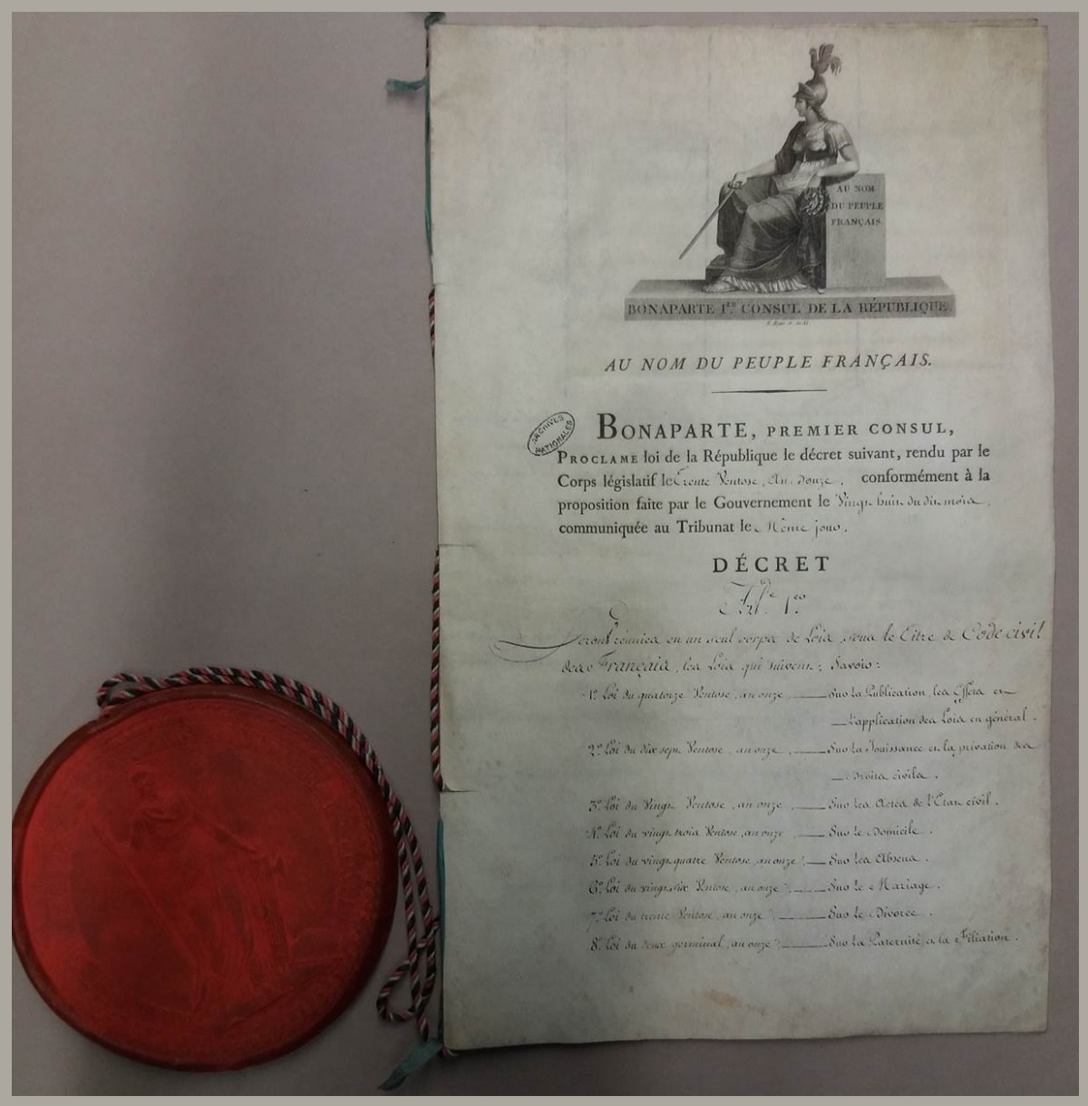 Adopté entre 1803 et le début de 1804 par le Corps législatif, le Code civil comporte 36 lois et 2 281 articles, organisés en trois livres consacrés aux personnes, aux biens et à la propriété. L’ensemble est regroupé et promulgué par la loi du 30 ventôse an XII (21 mars 1804). Tout l’ancien droit – les lois romaines, les ordonnances, les coutumes générales ou locales, les statuts, les règlements – est abrogé. Le droit s’est séparé de la religion. Ce 21 mars 1804, le “Code civil des Français” est né.