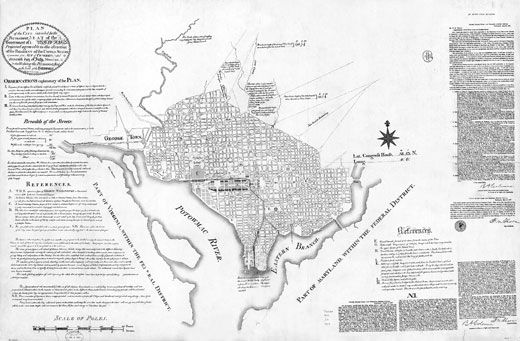 Eventually, the city’s surveyor, Andrew Ellicott, produced an engraved map that provided details for lot sales. It was very similar to L’Enfant’s plan (with practical changes suggested by officials), but the Frenchman got no credit for it. L’Enfant, now furious, resigned at the urging of Thomas Jefferson. When L’Enfant died in 1825 he had never received payment for his work on the capital and the city was still a backwater (due partly to L’Enfant’s rejected development and funding proposals).