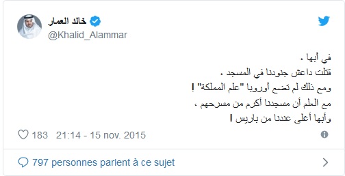 Lorsque Daech a tué des Saoudiens dans la mosquée Abha, «l’Europe n’a pas affiché le « drapeau du royaume » sachant que notre mosquée est plus digne que leur théâtre», affirme ce post sur Twitter