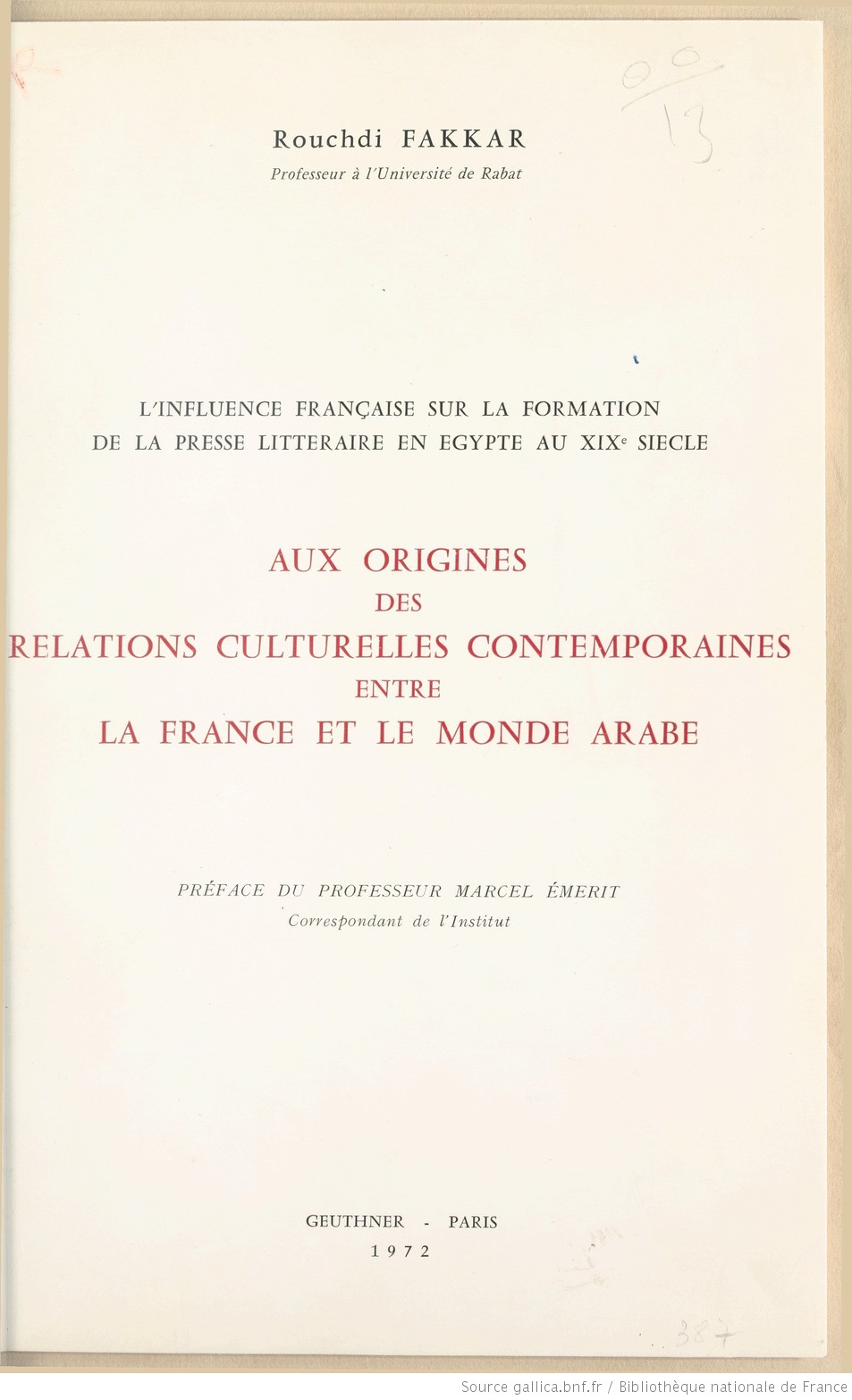 Quand elle est fondée seulement sur des comparaisons (le « ceci engendre cela »), l’étude des influences ne satisfait que des curieux peu familiarisés avec la véritable histoire, qui est une science de l’homme. Si l’on veut comprendre une nation, ses éléments vitaux, son esprit, il faut effectuer bien des recherches et s’attacher à connaître les ferments les plus puissants, que l’historien a pour tâche d’identifier et d’isoler. Pour nous faire saisir la physionomie intellectuelle de l’Egypte contemporaine, Rouchdi Fakkar s’est attaché à nous montrer ce qu’elle doit à l’influence de la France en étudiant de près, d’une part les journaux français publiés dans ce pays depuis l’expédition de Bonaparte, d’autre part la presse égyptienne abreuvée par des sources françaises.