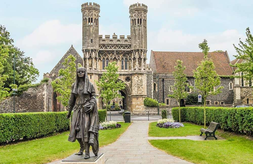 A statue of Queen Bertha stands in front of the entrance gate to the King’s School, Canterbury© Olaf Protze/LightRocket via Getty Images