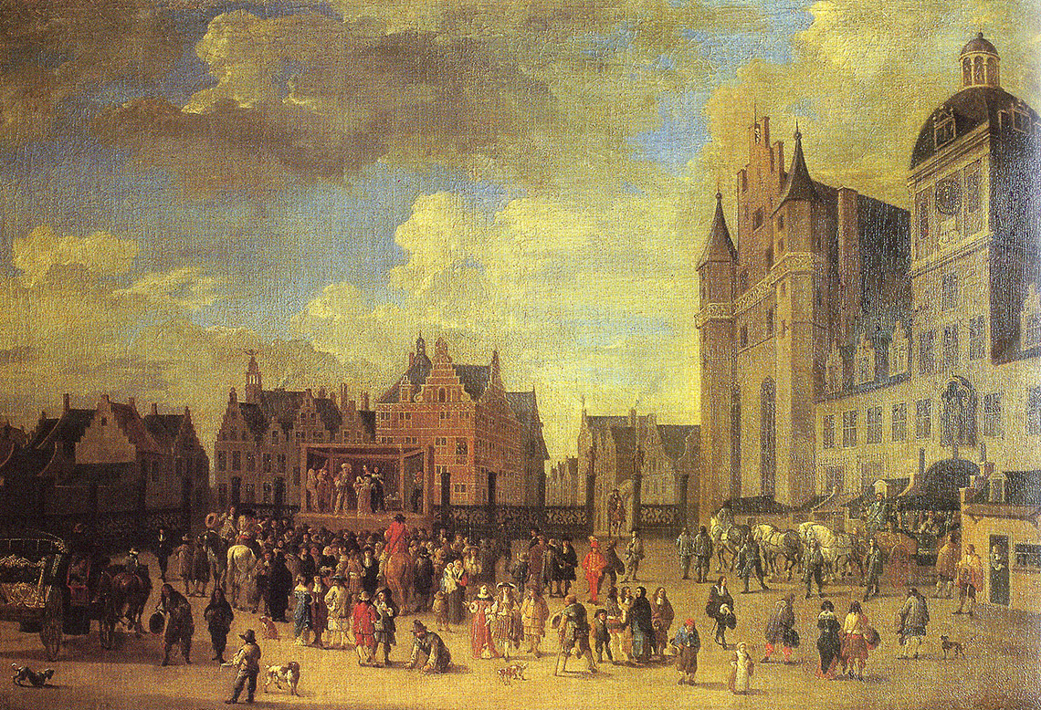 Guidée certes par un souci de qualité de vie, cette architecture de décor se tourne avant tout vers la vie publique, sociale et mondaine. En effet, le XVIIIe siècle voit la construction de places, de halles, de fontaines ou encore de théâtres et autres lieux de divertissements où prédomine l’alignement de façades d’une grande sobriété, voire d’une façade unique reprenant la forme d’un palais ou d’un hôtel de maître. Les places royales découlent de ces ensembles à programme imposant aux acquéreurs des terrains une servitude perpétuelle auxquels s’ajoute un élément nouveau, l’érection d’un monument en l’honneur du souverain. Chaque fois qu’elles en ont l’occasion, les villes demandent au roi la permission de lui élever une statue. Jusque dans les années 1750, elles représentent ce dernier en guerrier victorieux, mais ensuite, on assiste à une mutation des mentalités et le souverain, despote éclairé et pacificateur, est représenté debout ou assis. Afin de conduire le regard vers la statue érigée au centre, l’accès à la place se fait par les axes médians. D’autres rues aboutissent malgré tout aux angles des places, mais elles sont cachées par des artifices, des grilles ou des arcades. A l’imitation de la France et des places royales de Paris, Nancy ou Reims, ce thème se répandit dans toute l’Europe au cours de la seconde moitié du XVIIIe siècle, comme en témoignent la place du commerce à Lisbonne, la place Amalienborg à Copenhague et bien entendu la place Royale à Bruxelles.