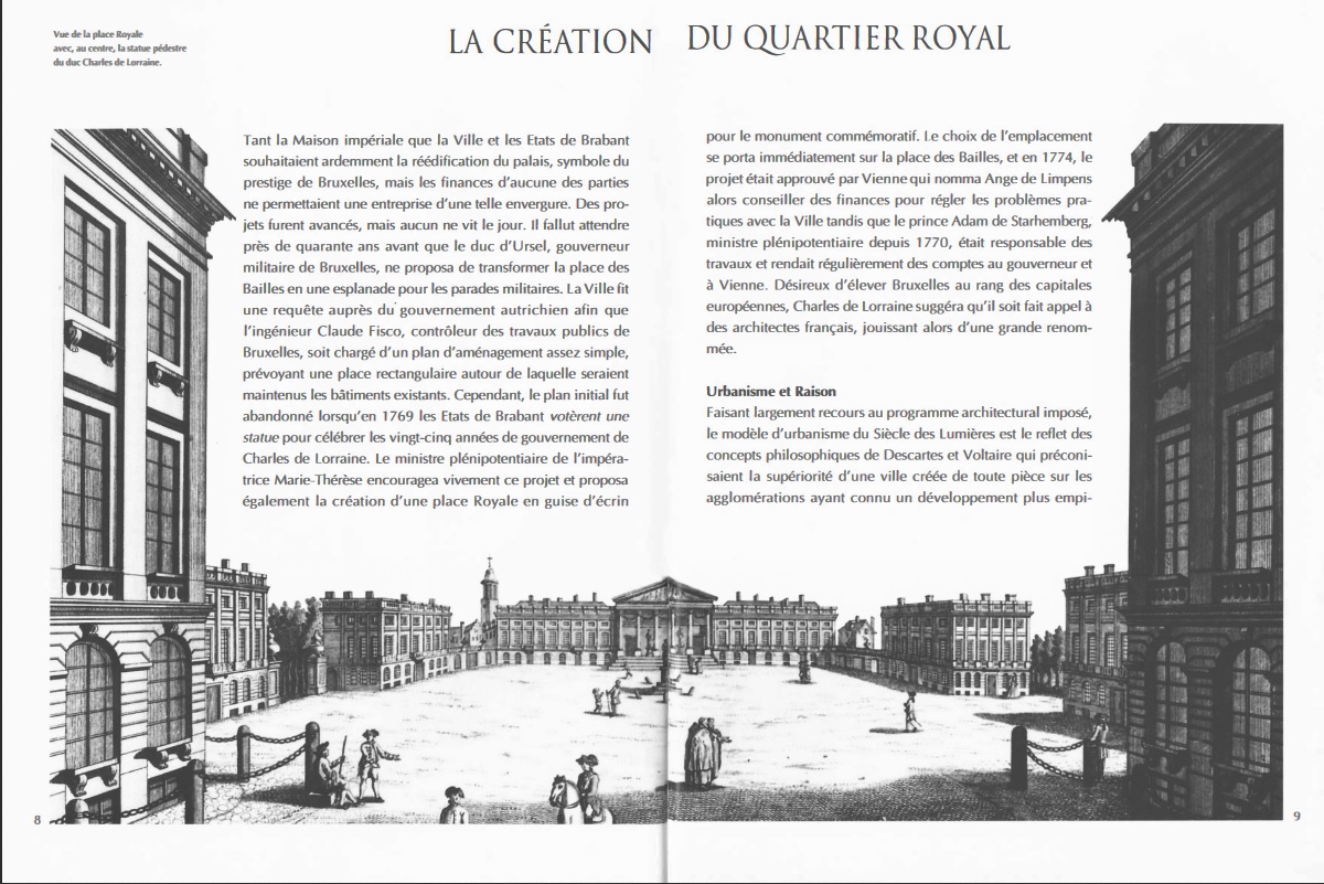 Tant la Maison impériale que la Ville et les États de Brabant souhaitaient ardemment la réédification du palais, symbole du prestige de Bruxelles, mais les finances d’aucune des parties ne permettaient une entreprise d’une telle envergure. Des projets furent avancés, mais aucun ne vit le jour. li fallut attendre près de quarante ans avant que le duc d’Ursel, gouverneur militaire de Bruxelles, ne proposa de transformer la place des Bailles en une esplanade pour les parades militaires. La Ville fit une requête auprès du· gouvernement autrichien afin que l’ingénieur Claude Fisco, contrôleur des travaux publics de Bruxelles, soit chargé d’un plan d’aménagement assez simple, prévoyant une place rectangulaire autour de laquelle seraient maintenus les bâtiments existants. Cependant, le plan initial fut abandonné lorsqu’en 1769 les Etats de Brabant votèrent une statue pour célébrer les vingt-cinq années de gouvernement de Charles de Lorraine. Le ministre plénipotentiaire de l’impératrice Marie-Thérèse encouragea vivement ce projet et proposa également la création d’une place Royale en guise d’écrin pour le monument commémoratif. Le choix de l’emplacement se porta immédiatement sur la place des Bailles, et en 1774, le projet était approuvé par Vienne qui nomma Ange de Limpens alors conseiller des finances pour régler les problèmes pratiques avec la Ville tandis que le prince Adam de Starhemberg, ministre plénipotentiaire depuis 1 770, était responsable des travaux et rendait régulièrement des comptes au gouverneur et à Vienne. Désireux d’élever Bruxelles au rang des capitales européennes, Charles de Lorraine suggéra qu’il soit fait appel à des architectes français, jouissant alors d’une grande renommée.
