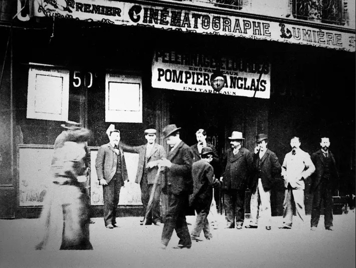 Le 28 décembre 1895, dans le Grand Café à Paris, les Lumière organisèrent la première projection publique d’un film au monde. La sortie des ouvriers de l’usine Lumière fut leur premier film, qui, comme son titre l’indique, montrait tout simplement des ouvriers quittant l’usine Lumière. Si cette première serait aujourd’hui considérée comme prosaïque, la clarté et le réalisme de ce film de 50 secondes en noir et blanc avait, à l’époque, fait sensation.