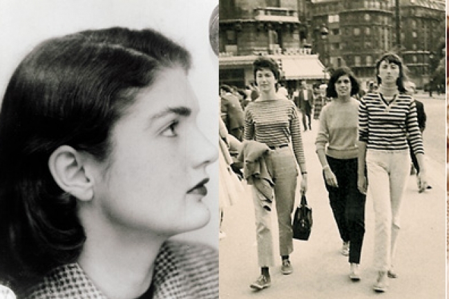 Courtesy Claude du Granrut, Photo by unknown Paris street photographer, Michelle Vignes Left: Jacqueline Bouvier’s student ID photo from 1949-50. Center: Susan Sontag (center), Harriet Sohmers (right), and Harriet’s sister Barbara on the Pont au Double in 1950. Right: Angela Davis at a news conference in 1972.