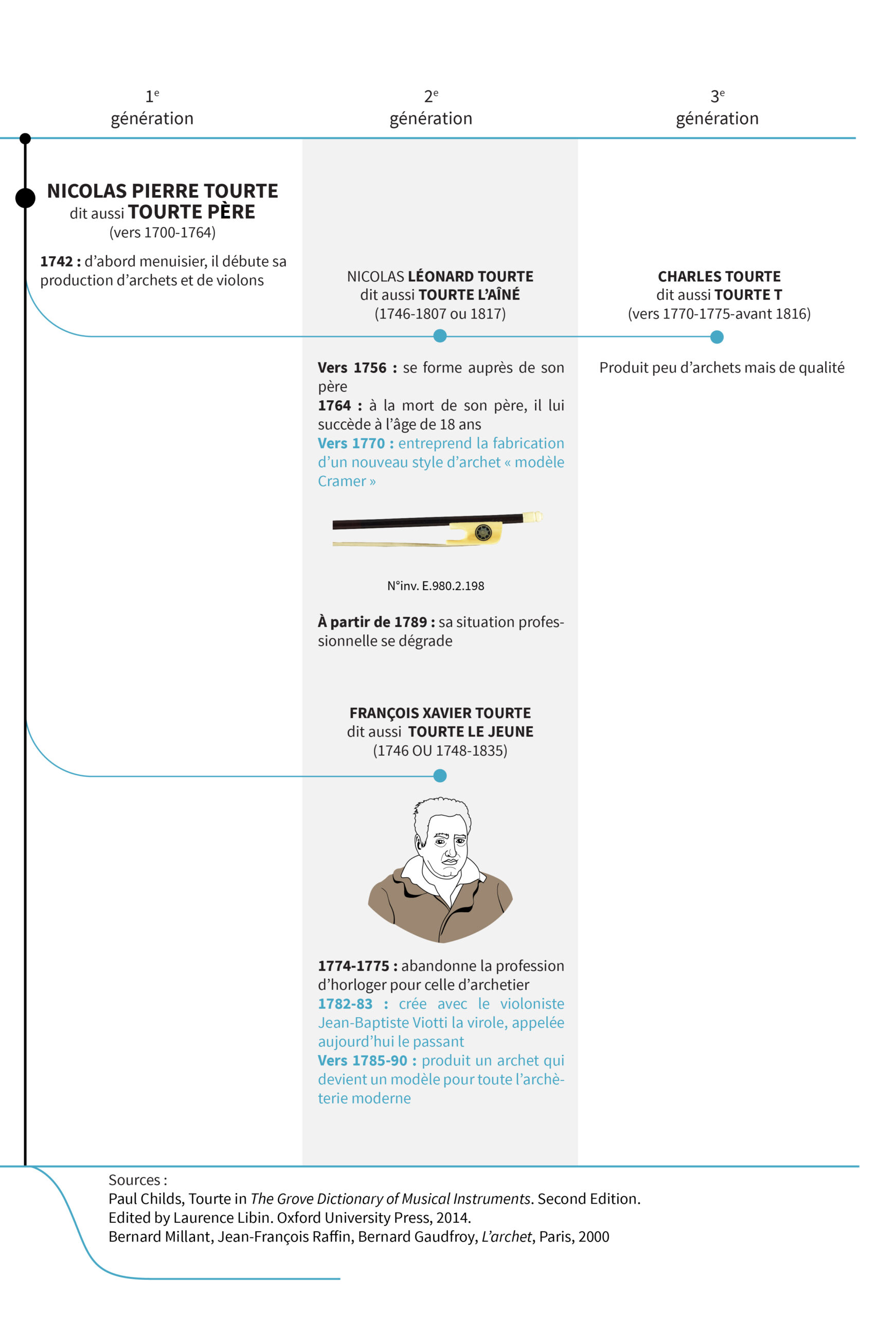 Nicolas Léonard Tourte dit aussi Tourte l’aîné (1745-1807) est l’un des premiers archetiers à temps complet et donne, avec son frère Tourte le jeune, un vrai élan à l’archèterie française. Il fabrique à partir de 1770 des archets de modèle Cramer portant les marques « TOURTE·L » et « AUX 15 VINGT », indiquant qu’il disposait, jusqu’en 1780, d’un atelier dans cette institution. Il s’installe ensuite place de l’Ecole, face à la boutique du luthier Salomon, dont il bénéficie de la clientèle riche et aristocratique.