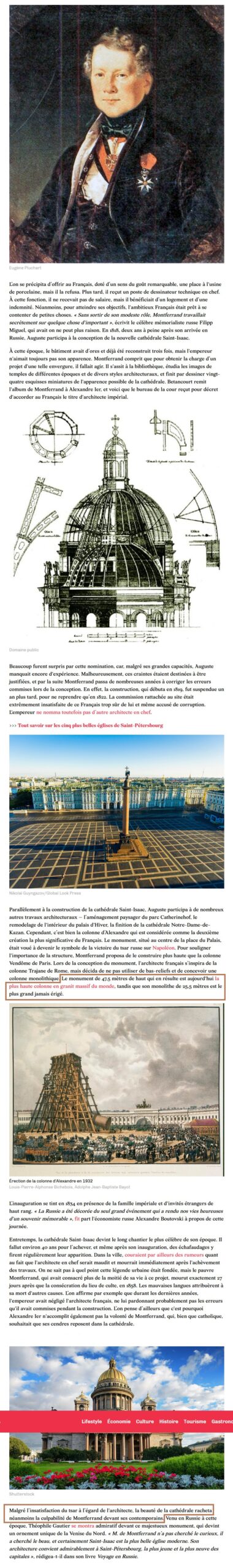 Imaginons qu’Auguste Montferrand n’a jamais été au service des Romanov, sous nos yeux, Saint-Pétersbourg perdrait immédiatement de son faste. Ce Français, architecte talentueux, dont le nom est peu connu dans son pays natal, a en effet offert à la Venise du Nord sa carte de visite principale – la grandiose cathédrale Saint-Isaac, et a également décoré la place du Palais avec le plus haut monument monolithique du monde. Ainsi, les touristes français qui se promènent dans le centre historique de la ville ont-ils le droit d’être fiers de leur compatriote.