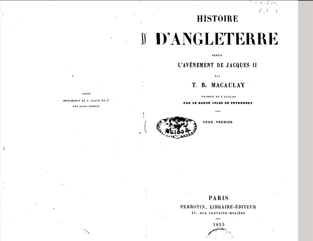 Histoire d’Angleterre depuis l’avénement de Jacques II, Volume 1 De Thomas Babington Macaulay, édition française Perrotin, 1853, traduction Jules de Peyronnet