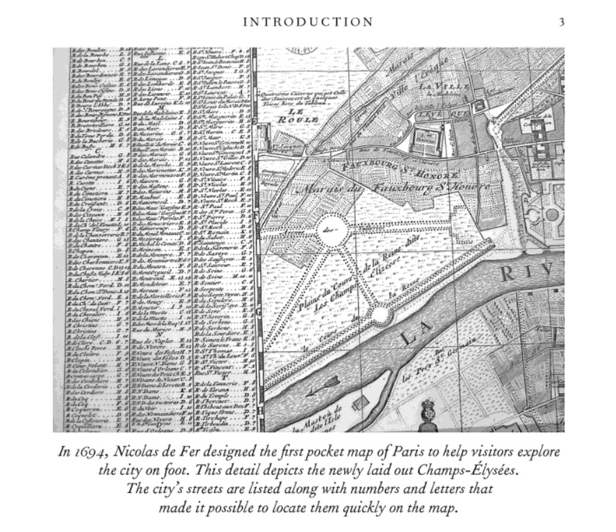Near the end of the seventeenth century, a new kind of publication began to appear: pocket guidebooks and maps specifically designed for visitors who planned to explore a city on foot. These ancestors of today’s guidebooks were created to introduce Europeans to Paris. It was a city that, their authors felt, had become such a revolutionary kind of place that it needed to be seen in this way to be understood. The genre began in 1684 with the first edition of Germain Brice’s Description nouvelle de ce qu’il y a de plus intéressant et de plus remarquable dans la ville de Paris, soon translated into English as A New Description of Paris, destined to become the best—selling guide to any city until the 1750s.