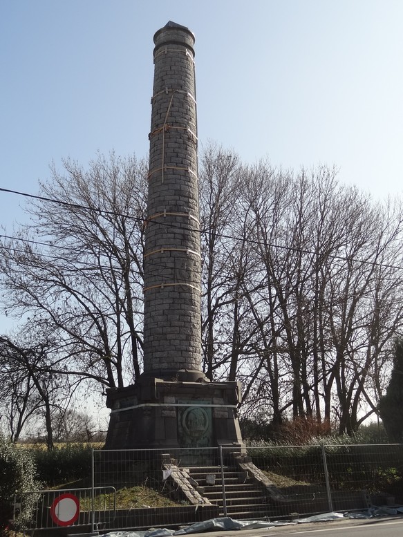 Le coq quant à lui n’était pas un coq wallon (le choix de cet emblème ne sera réalisé par l’Assemblée wallonne qu’au printemps 1913), mais devait être le coq chantant d’Auguste Cain. Il fut réalisé et resta dans une fonderie bruxelloise jusqu’en 1918, moment où l’emblème fut envoyé à la refonte. La Grande Guerre avait mis un terme au chantier, sans que l’occupation n’endommage les lieux. Les comités belge et français sont dispersés, d’autant que le décès inopiné d’Hector Fleichmann (victime d’une méningite en février 1914) avait déjà porté un coup dur au projet. Dès 1914, l’ensemble est impressionnant : avec ses 18 mètres de haut, il est destiné à dominer la plaine du champ de bataille de Waterloo, sans toutefois parvenir à faire de l’ombre à la célèbre butte, distante de 1500 mètres. La colonne aurait été conçue selon les proportions du nombre d’or (d’après les recherches récentes de Claude Van Hoorebeeck), en raison de l’appartenance de Fleichmann à la franc-maçonnerie (il était secrétaire général pour la France du Comité Victor Hugo et surtout initié à la loge « Victor Hugo » du Grand Orient de France). Le monument comprend deux parties : le fût dont la circonférence se réduit avec la hauteur comporte 61 anneaux de pierres taillées, de sa base jusqu’à la couronne ; viennent ensuite deux anneaux puis le chapiteau final.