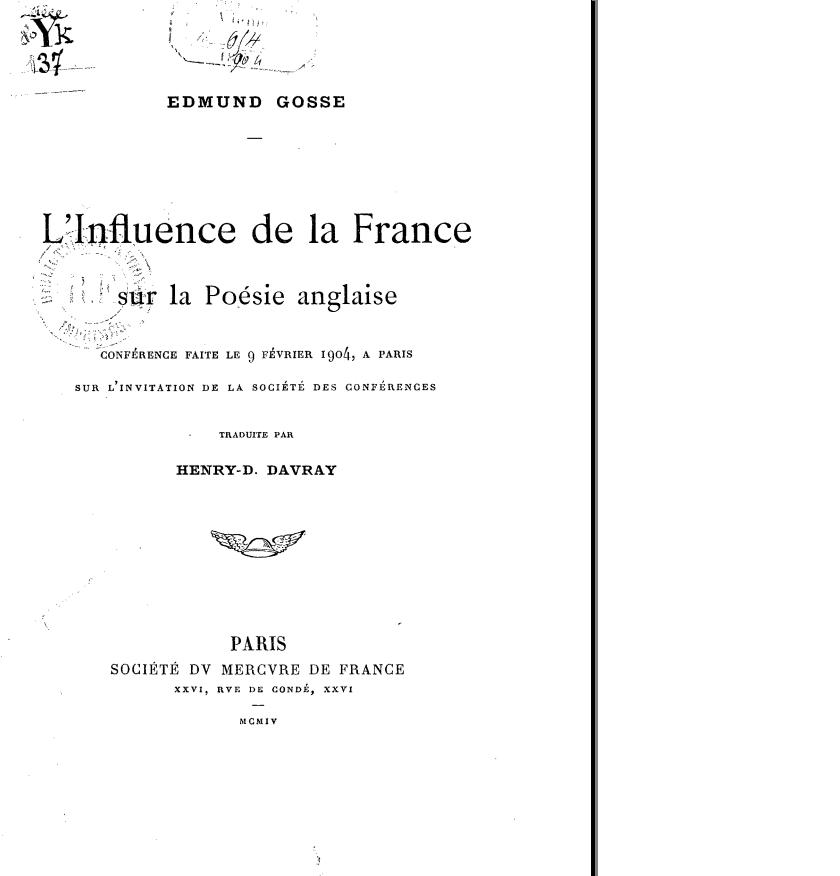 Nous avons examiné maintenant deux cas, d’importance très différente, dans lesquels, à des moments critiques, la poésie anglaise reçut, de l’art voisin de la France une couleur distincte. Dans chaque cas, l’influence s’exerça à un moment où l’ambition poétique de notre pays excédait grandement l’habileté technique de ceux qui voulaient l’exprimer, et où les versificateurs étaient heureux d’aller à l’école de maîtres plus qu’eux habitués à l’art et à la grâce.