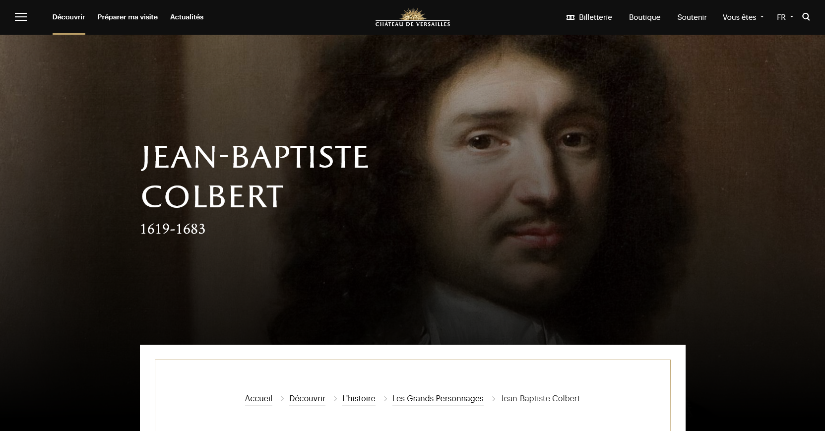 Jean-Baptiste Colbert, contrôleur général des Finances de Louis XIV, a cumulé presque toutes les charges de l’État. Considéré comme un gestionnaire accompli, il se charge du développement du commerce, de l’industrie, de la Marine royale, de l’aménagement de Paris et de l’essor des sciences. En relation constante avec le roi, il reste l’un de ses meilleurs hommes de confiance.