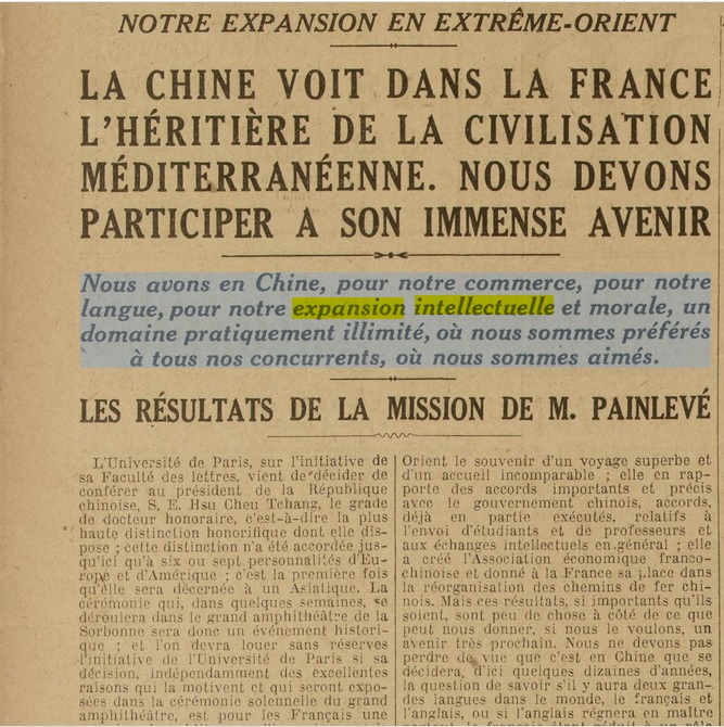 Nous avons en Chine, pour notre commerce, pour notre langue, pour notre expansion intellectuelle et morale, un domaine pratiquement illimité, où nous sommes préférés à tous nos concurrents, où nous sommes désirés et aimés ; laisserons-nous par négligence, faute de quelques très légers sacrifices au moment opportun, dépérir ces possibilités immenses, tel Louis XV abandonnant les « arpents de neige » du Canada ?