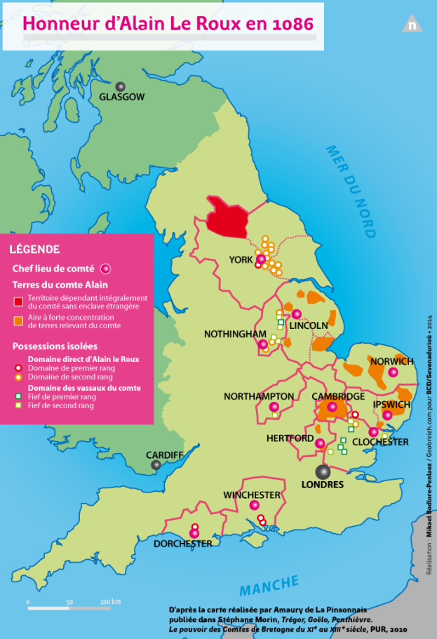 Guillaume, duc des Normands, aidé par un important contingent de Bretons, accède, après sa victoire à la bataille de Hastings de 1066, au titre de roi des Anglais. De 1066 à 1135 environ, lui et ses successeurs attirent en Angleterre des chevaliers bretons qui viennent renforcer les rangs de leurs fidèles. Ceux-ci, issus de la petite et moyenne aristocratie, proviennent du nord-est de la Bretagne. S’installant définitivement en Angleterre, ils s’intègrent rapidement à la noblesse normande et anglo-saxonne.