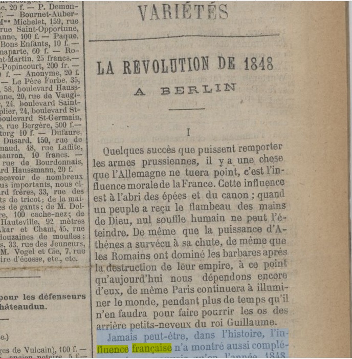 Quelques succès que puissent remporter les armes prussiennes, il y a une chose que l’Allemagne ne tuera point, c’est l’influence morale de la France. Cette influence est à l’abri des épées et du canon ; quand un peuple a reçu le flambeau des mains de Dieu, nul souffle humain ne peut l’éteindre. De même que la puissance d’Athènes a survécu à sa chute, de même que les Romains ont dominé les barbares après la destruction de leur empire, à ce point qu’aujourd’hui nous dépendons encore d’eux, de même Paris continuera à illuminer le monde, pendant plus de temps qu’il n’en faudra pour faire pourrir les os des arrière petits-neveux du roi Guillaume.