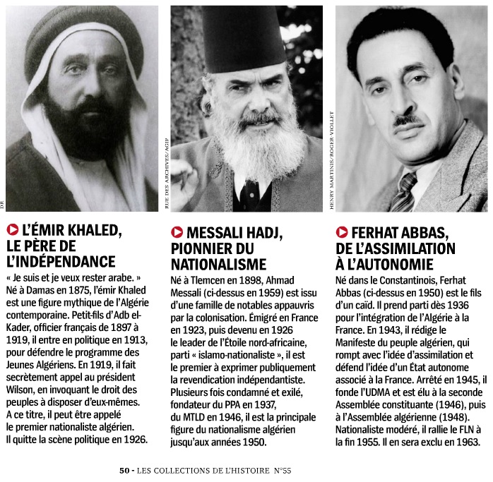 Dénoncés par leurs compatriotes comme des renégats ambitieux, les Jeunes Algériens crurent habile de s’adjoindre celui qu’ils appelaient l’émir Khaled, un petit-fils d’Abd el-Kader. En décembre 1913, il vint à Paris défendre leur programme : « Associez-nous à votre prospérité et à votre justice. Nous serons avec vous aux heures du danger. » Bien qu’il ait tenu parole pendant la guerre de 1914-1918, il rêvait d’un rôle plus glorieux. Invoquant le droit des peuples à disposer d’eux-mêmes, il fit secrètement appel, en mai 1919, au président Wilson : « Nous demandons l’envoi de délégués choisis librement par nous pour décider de notre sort futur, sous l’égide de la Société des nations. » L’émir Khaled peut donc être légitimement appelé le premier nationaliste algérien.