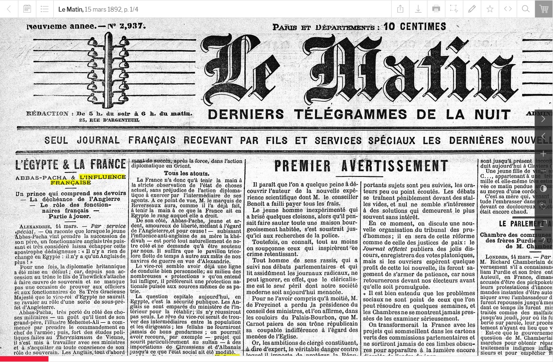Il faut donc constater une amélioration réelle de la prépondérance française en Égypte, amélioration qui se traduit chaque jour par des faits certains et qui s’appuie sur l’attitude même du khédive, soutenu lui-même par le sultan.