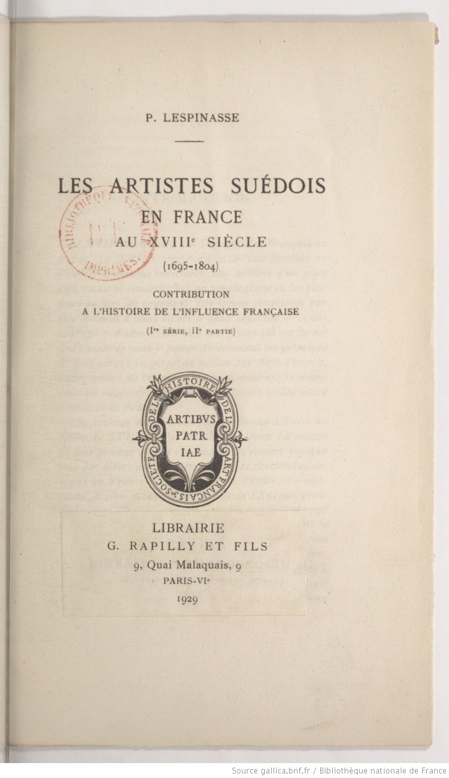 Les Artistes suédois en France au XVIIIe siècle (1695-1812). Contribution à l’histoire de l’influence française (1re série. Deuxième partie) /  Auteur : Lespinasse, Pierre (1881-1943). Date d’édition : 1929 Type : monographie imprimée Langue : français