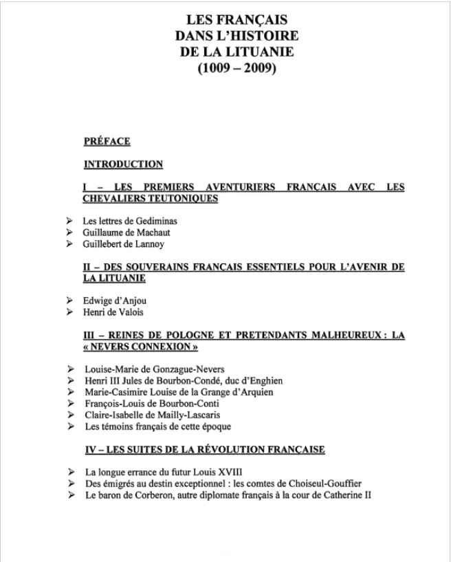La Lituanie n’est pas un Etat jeune. puisque son nom est apparu il y a exactement mille ans, le 14 février 1009. Ce fut même au XVe siècle le plus grand Etat européen, s’étendant de la Baltique à la mer Noire. Néanmoins. il reste aujourd’hui largement méconnu des Français et bien souvent l’incompréhension mutuelle a prédominé dans les rapports entre ces deux Etats. Pourtant, de nombreux liens ont uni la France et la Lituanie depuis le Grand-duc Vytautas jusqu’aux événements de 1990-91 au cours desquels la Lituanie a reconquis son indépendance. En effet, nombreux sont les Français qui y sont passés au cours de l’histoire, voire qui s’y sont installés. Certains ont même eu une influence prépondérante, comme Edwige d’Anjou, à l’origine de la conversion de la Lituanie au christianisme. Ou encore Henri de Valois. futur roi de France, Henri III, éphémère Roi de Pologne – Grand-duc de Lituanie, mais qui a laissé en héritage ce qui entraînera, deux siècles plus tard, la disparition de la » République des deux Nations « . Mais surtout, si on dit » Français en Lituanie » aux Lituaniens, ils répondront spontanément Napoléon tant fut grand l’espoir de liberté qu’il a apporté en 1812. Du plus humble au plus prestigieux, il est fait ici une galerie de portraits de Français qui. chacun à leur niveau, ont marqué l’histoire de la Lituanie pendant un millénaire.
