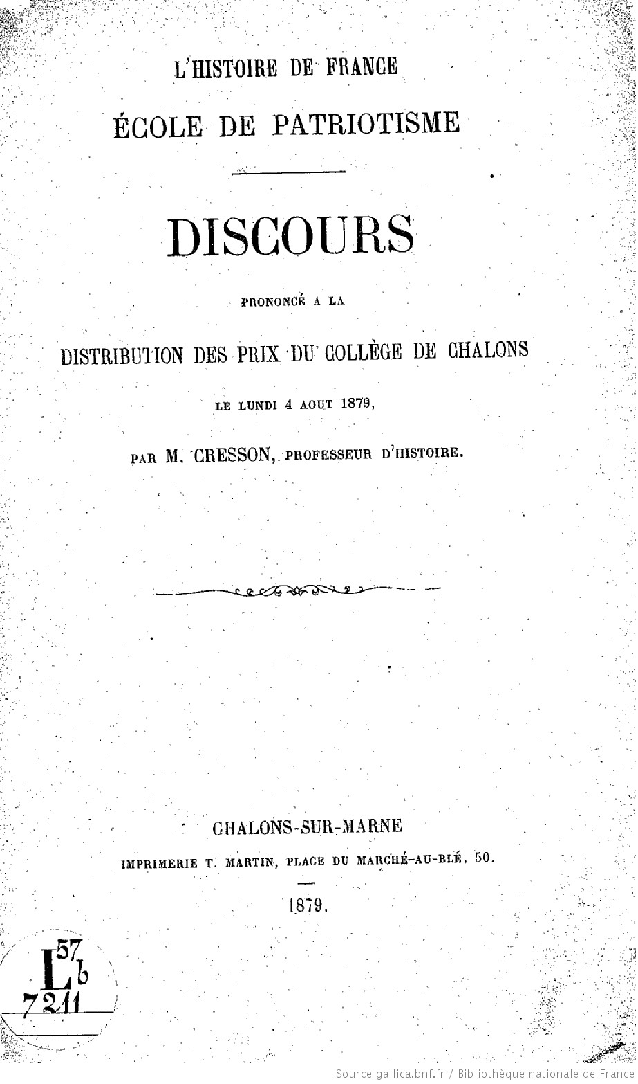 Chargé de porter la parole en ce jour, où des vainqueurs, dont les plus âgés ont à peine atteint l’adolescence, vont recevoir la récompense pacifique des premiers efforts de la vie, je voudrais aussi, jeunes gens, allumer dans vos cœurs une flamme pure et féconde, une passion qui fera la noblesse et la dignité de votre vie : l’ amour de la France. Et que puis-je faire de plus opportun que de vous entretenir un instant d’un poème plus sublime que l’Iliade, d’un récit plus beau et plus attrayant que les livres d’Hérodote, d’un drame plus émouvant et plus magnifique que les tragédies d’Eschyle ou de Sophocle, drame dans lequel paraissent des personnages plus vaillants et plus irréprochables que les héros des temps anciens; où se déroulent des scènes, où s’accomplissent des événements d’un ordre si élevé qu’on a pu les nommer les Actes de Dieu même, Gesta Dei per Francos. J’ai désigné l’histoire de France, ou plutôt du peuple de France.