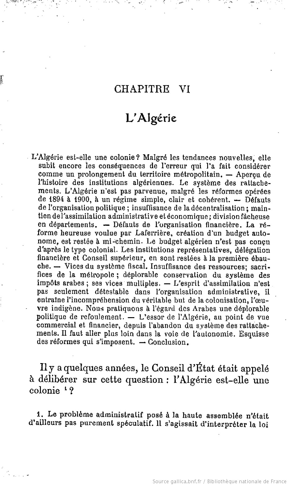 Cette anecdote administrative est assez suggestive. J’en pourrais citer d’autres. Semblable à la chauve-souris de la fable, l’Algérie change volontiers de personnage. S’agit-il de revendiquer quelque avantage du statut métropolitain : « Je suis partie intégrante du territoire français, s’écrie-t-elle ; voyez mes départements! » S’agit-il d’éviter les charges correspondantes : « Je suis colonie, reprend-elle aussitôt ; voyez mon Gouverneur général ! »