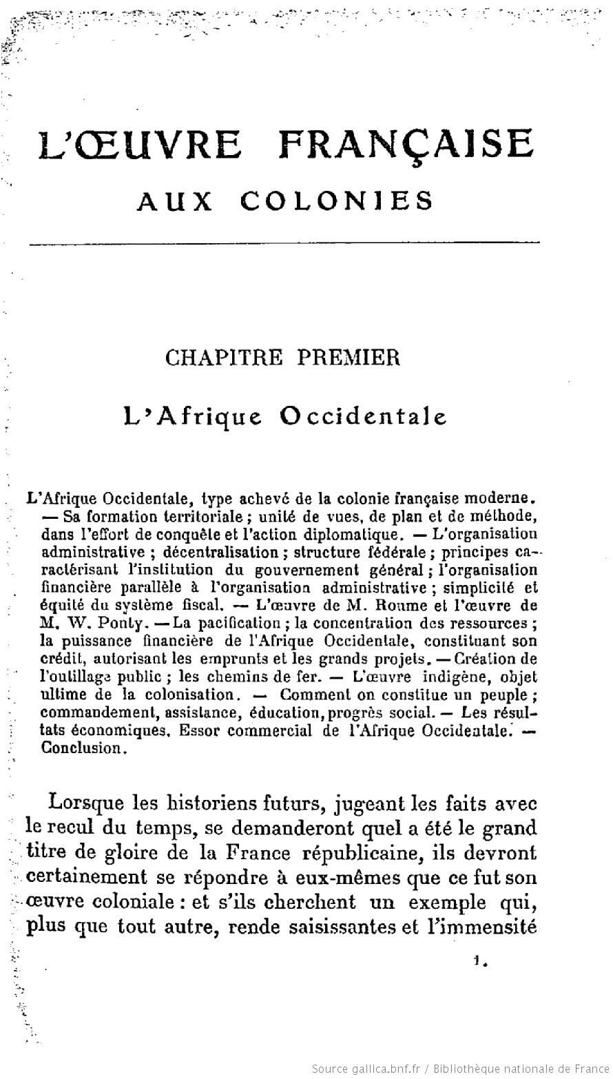 Lorsque les historiens futurs, jugeant les faits avec le recul du temps, se demanderont quel a été le grand titre de gloire de la France républicaine, ils devront certainement se répondre à eux-mêmes que ce fut son oeuvre coloniale : et s’ils cherchent un exemple qui, plus que tout autre, rende saisissantes et l’immensité de la tâche, et la sûreté de la méthode, et la beauté des résultats, ils choisiront, j’en suis certain, l’Afrique Occidentale.