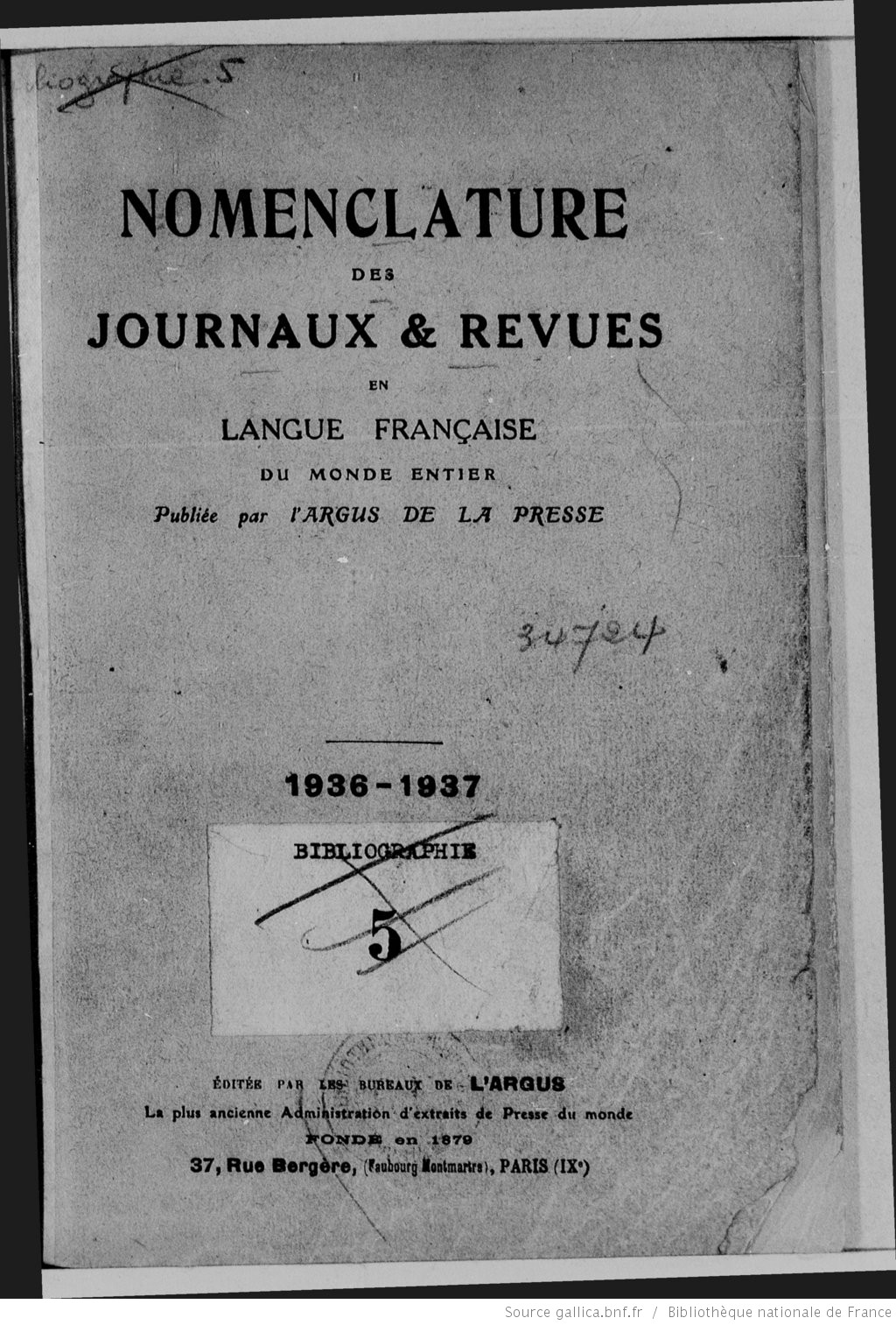 Cet ouvrage de près de 800 pages, format octavo-raisin, constitue la septième édition de « NOMENCLATURE des Journaux en Langue Française » qu’a publiée l’Argus depuis 1917. Les tirages de ce volume ont varié de 10 à 25.000 exemplaires.
