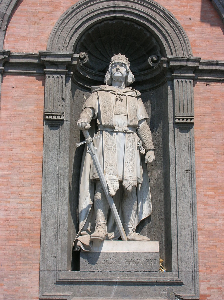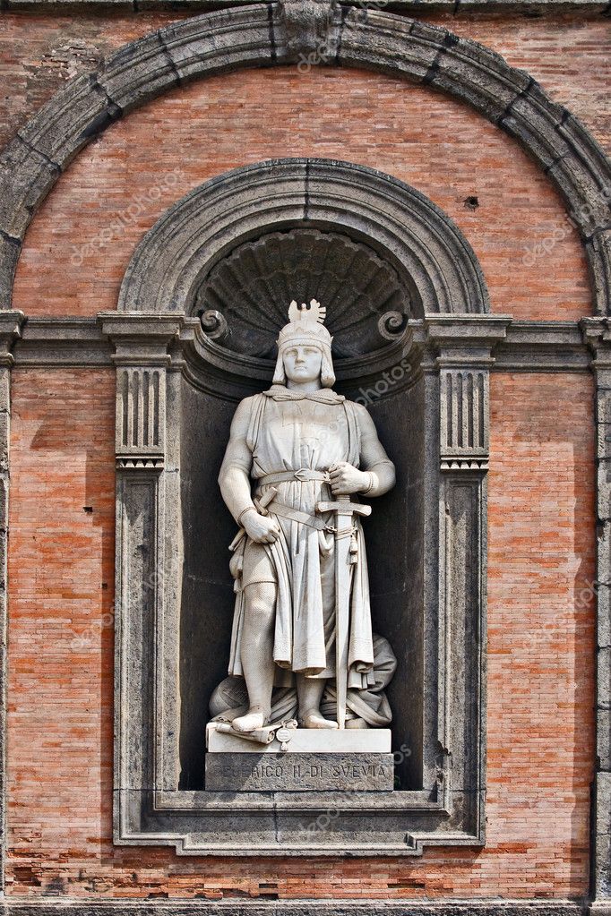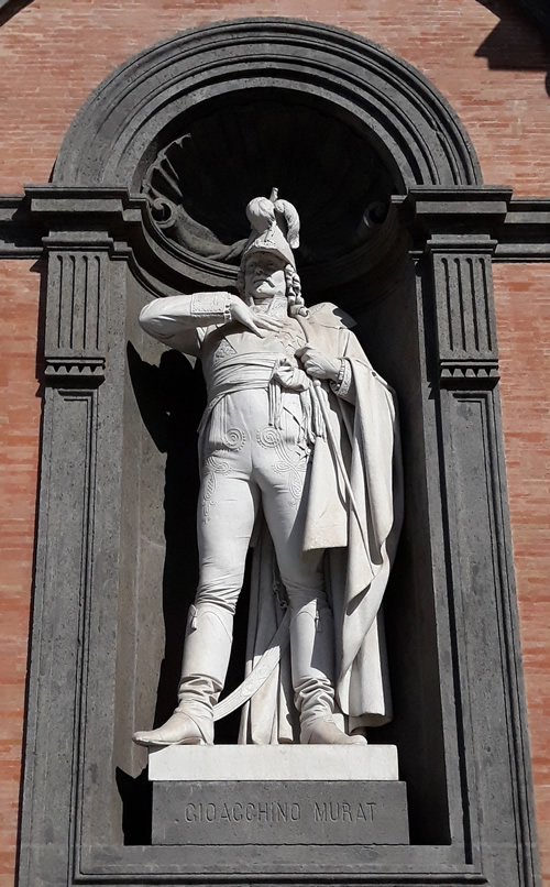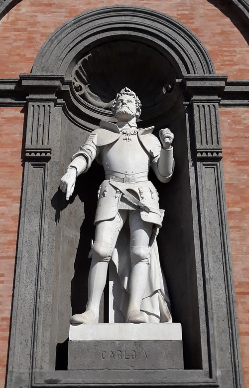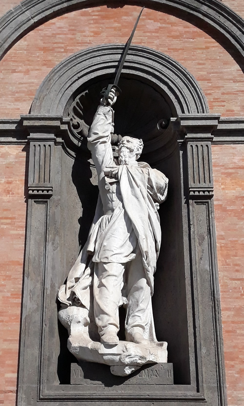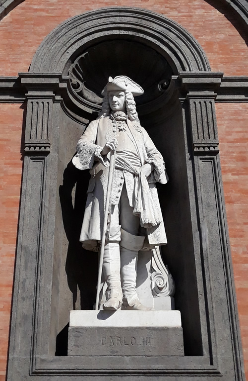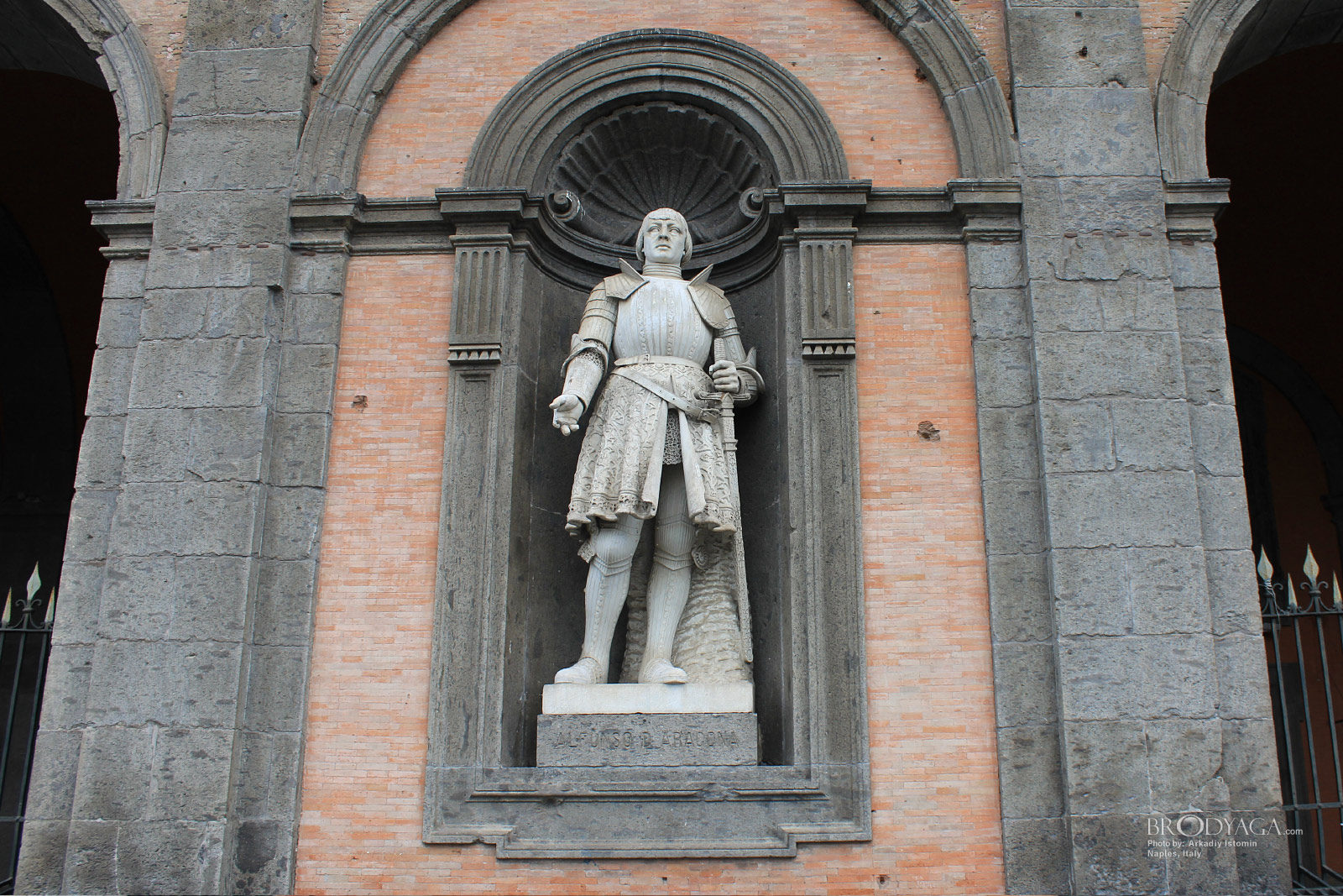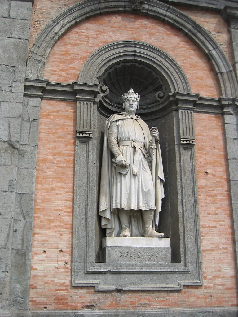 En 1888, sur ordre d’Humbert Ier, les niches extérieures furent occupées par des statues des rois de Naples, les premiers de chaque dynastie. De gauhe à droite : Roger II de Sicile (« Roger le Normand »), Frédéric II de Souabe (Saint Empire), Charles Ier d’Anjou, Alphonse V d’Aragon, Charles V de Habsbourg, Charles III de Bourbon, Joachim Murat (le général de Napoléon) et Victor-Emmanuel II de Savoie, le premier roi de l’Italie unifiée.