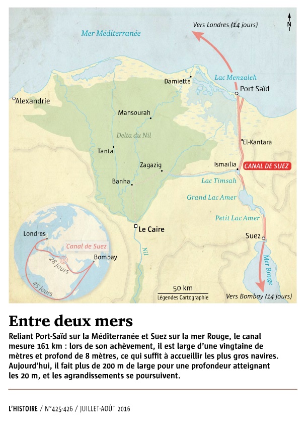 Du canal de Suez dépend toute la civilisation matérielle de l’Europe », écrit André Siegfried en 1948. Avec l’ouverture du canal en 1869, l’isthme de Suez devient en effet une route maritime majeure. En réduisant les distances entre l’Europe et l’Asie, cette route offre au Vieux Continent les perspectives d’une planète ouverte et disponible ; elle accompagne, en cette fin de XIXe siècle, la formidable croissance du commerce maritime ainsi que l’expansion des empires coloniaux.