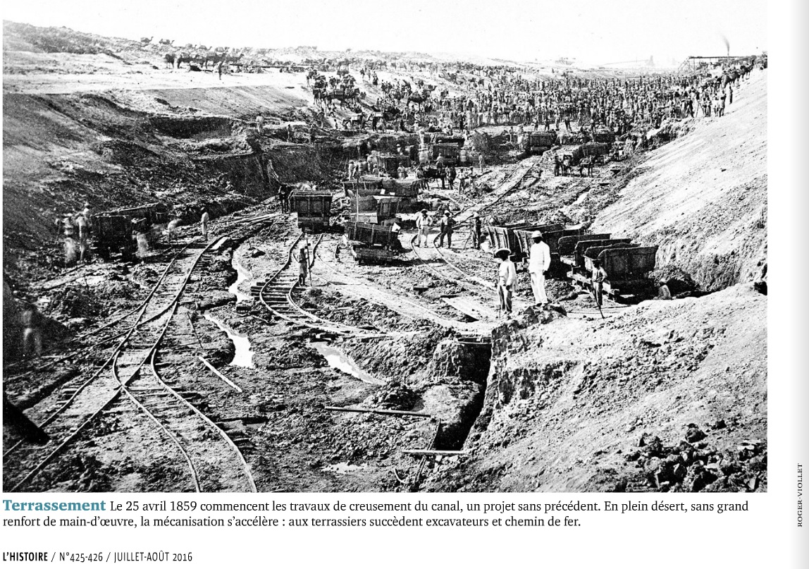 Le 25 avril 1859, le premier coup de pioche est donné. Par son ampleur, ses difficultés et son site – un désert aux confins du Sinaï -, le percement de l’isthme de Suez figure parmi les plus grands chantiers du XIXe siècle. La maîtrise de la nature par l’homme, la création ex nihilo de centres urbains – Port-Saïd et Ismaïlia -, l’installation des populations sont autant d’éléments qui rendent ce chantier exceptionnel. Le creusement du canal suppose de réaliser des terrassements d’un volume sans précédent, estimés par le Bulletin de la Société des ingénieurs civils de France (1857) à l’équivalent de douze plates-formes de chemin de fer accolées.